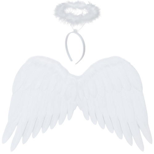 A hófehér szárnyak és a pántos glória együtt olyan hatást keltenek, amely bármilyen jelmezt kiemel, legyen szó angyalról, tündérről, manóról vagy más fantáziakarakterről.
