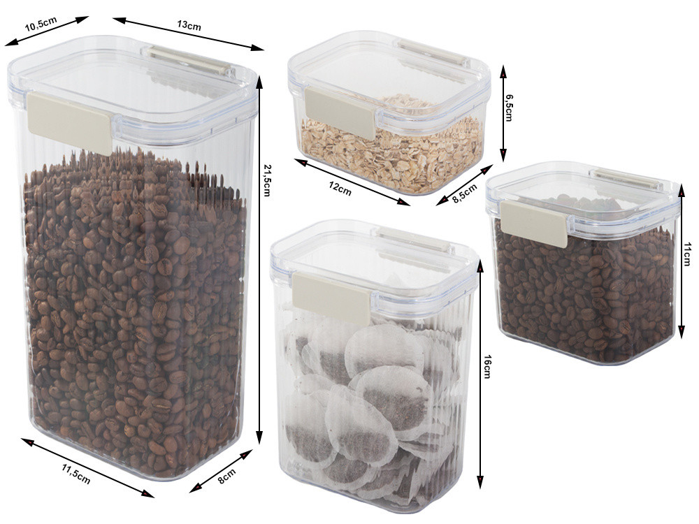 Biztosítsa élelmiszertermékei frissességét ezzel a kapoccsal és tömítéssel ellátott konyhai edénykészlettel. Termékünk ideális megoldás különféle termékek, például kávé, tea, gabonafélék, fűszerek, tészta, cukor vagy egyéb élelmiszerek tárolására.