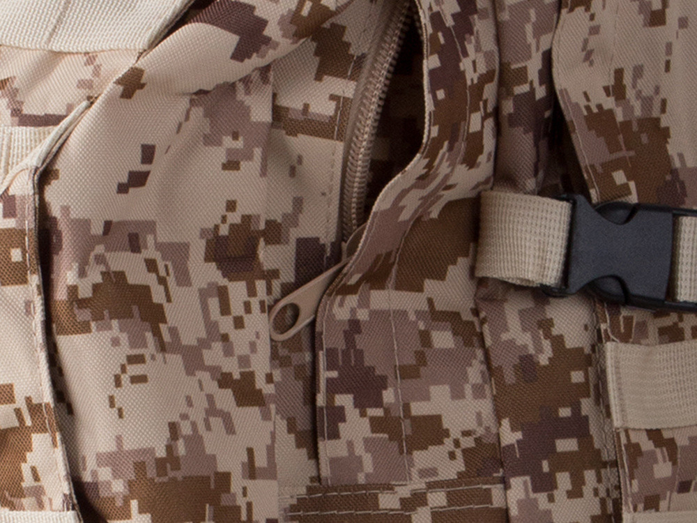 A hátizsák állítható MOLLE rögzítőkkel rendelkezik, amelyek lehetővé teszik további zsebek és modulok hozzáadását a táskához. Mellkas- és csípőövvel is felszerelve - lehetővé teszi a gerinc és a vállak tehermentesítését hosszú utazások során. Az állítható hevederek különösen hasznosak, ha olyan tárgyakat szállítanak, mint például kabátok, sátrak. A csípőöv masszív csattal és hosszúságállítással rendelkezik. Az öv becsatolása után a hátizsák nagyon stabil és nem dől oldalra viselés közben.
