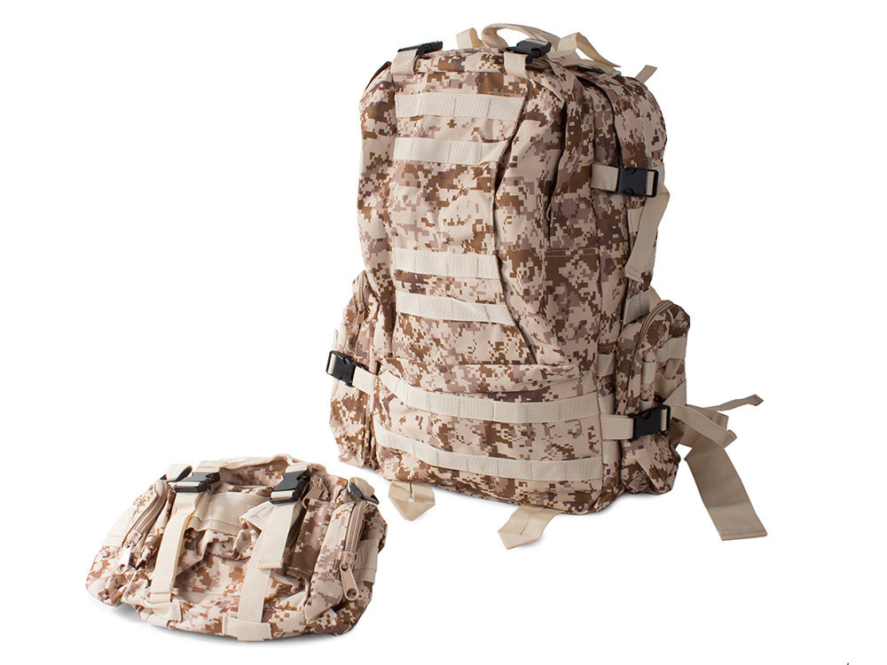 A hátizsák egy nagy rekeszből áll egy további rekesszel és egy hálós rekesszel. Oldalán két rögzíthető táska található, amelyek szükség esetén levehetők. A közepére egy nagyobb táska is van rögzítve, ami levehető és külön táskaként hordható. 4 kisebb kamrából áll - két oldalsó és kettő középső. Tökéletes különféle kisebb tárgyakhoz, kütyükhöz és dokumentumokhoz. Közvetlenül a nadrágszíjra rögzítheti, vagy normál deréktáskaként viselheti a mellékelt öv segítségével.