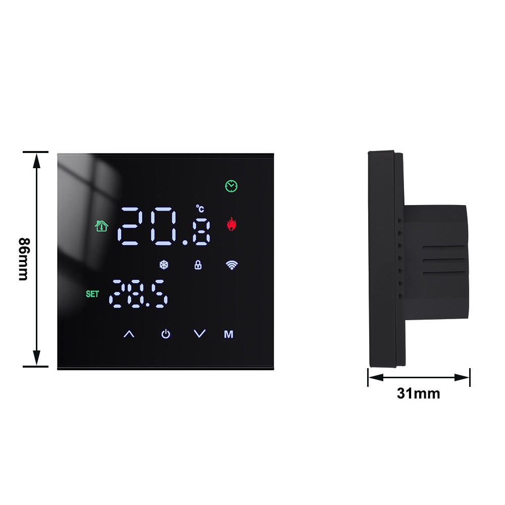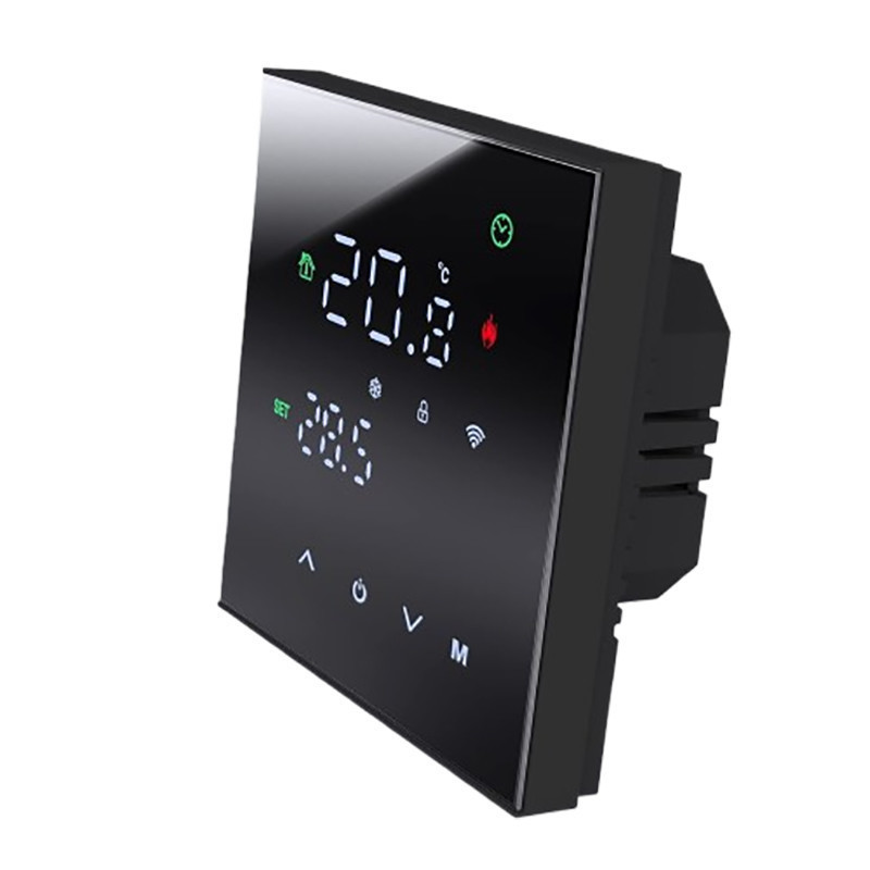 A termosztát 230 V AC/50 Hz hálózati feszültségről működik. A 16 A kapcsolási áramnak köszönhetően képes nagyobb teljesítményű fűtési rendszerek vezérlésére is. A termosztát hiszterézise 0,5 és 5 °C között állítható, amely lehetővé teszi a hőmérséklet pontos szabályozását az egyéni igények szerint. Memóriafunkció: A termosztát memóriafunkciójának köszönhetően kikapcsolás esetén minden beállítását biztonságosan megőrzi, hogy a használat mindig zökkenőmentes legyen. Programozható funkció: A termosztát programozható funkciója lehetővé teszi, hogy mobiltelefonján keresztül kényelmesen beállítsa az Ön igényeihez igazodó időzítéseket és hőmérsékleti értékeket. WiFi funkció: Az eszközt egy mobilalkalmazáson keresztül bárhonnan vezérelheti, így bármikor beállíthatja otthona ideális hőmérsékletét, akár távolról is. Ez a megbízható és egyszerűen kezelhető termosztát tökéletes választás azok számára, akik egy modern, intelligens otthoni rendszerbe integrálható eszközt keresnek. Széles hőmérséklet-tartományával és precíz mérési képességeivel ideális megoldást nyújt különféle fűtési és klimatizálási rendszerekhez, biztosítva a maximális kényelmet és energiahatékonyságot. Specifikációk: Tápellátás: 100 ~ 240 VAC, 50 ~ 60 Hz Áramterhelés: 3A (vízmelegítés, gázkazán), 16A (elektromos fűtés) Érzékelő: NTC, 10K Pontosság: ± 1 °C Hőmérséklet beállítási tartomány: 5-35 °C Hőmérséklet korlátozási tartomány: 5-60 °C Energiafogyasztás: Burkolat anyaga: PC + ABS (lángálló) Szerelvénydoboz: 86*86 mm négyzet alakú vagy európai 60 mm kerek doboz Vezetékcsatlakozás: vezeték 2x1,5 mm2 vagy 1x2,5 mm2 Védettségi osztály: IP20 Csomag tartalma: Termosztát Beszereléshez szükséges tartozékok