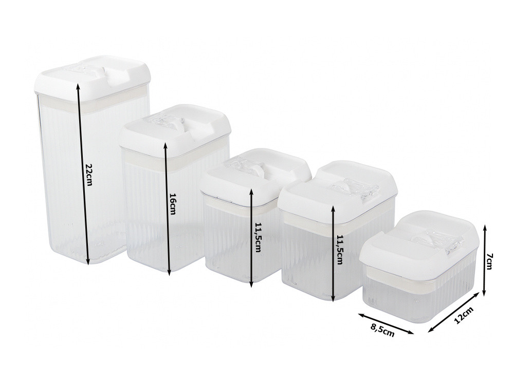 Ez az 5 darabos, légmentesen záródó, praktikus konyhai edénykészlet tökéletes megoldást kínál tészta, rizs, kása, reggeli gabonapelyhek, kávé, tea, keksz és édességek tárolására.